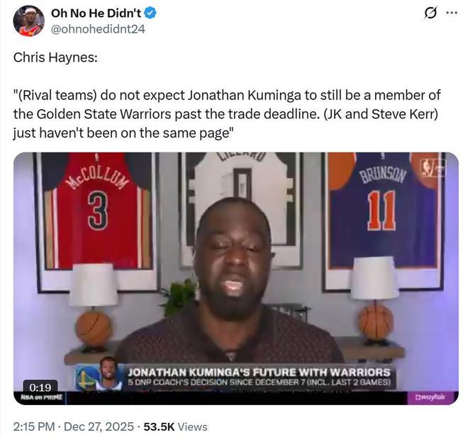 名记Chris Haynes与Brett Siegel都在报道中指出这一点,直言库明加离开勇士只是时间问题,在交易截止日前他将被勇士队交易掉。