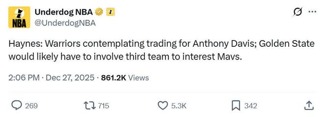 根据名记Chris Haynes报道,勇士队正在考虑一笔风险极大的交易方案,尝试追求10次入选全明星的独行侠大前锋浓眉哥。