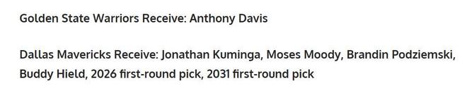 独行侠得到:库明加+穆迪+波杰+希尔德+26年首轮+31年首轮签。